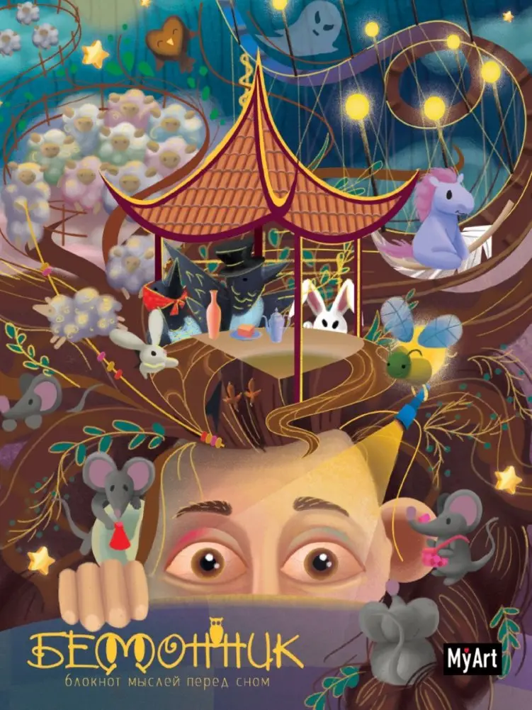 This notebook contains 160 pages designed for recording thoughts before sleep. It features vivid illustrations, practical recommendations for individuals experiencing insomnia, and sleep trackers. The publication includes informative facts about dreams, making the journaling process more engaging and insightful.