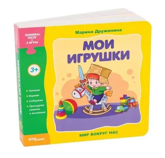 This toy book from the "Our World" series features a collection of short poems about toys and children's games. Each spread includes illustrations that double as interactive elements. Children can assemble colorful puzzles using the fragmented images provided on the pages.