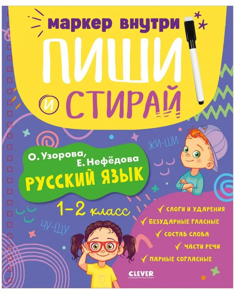 This reusable workbook is designed for students in grades 1-2, helping them master core Russian language curriculum topics. The reusable pages allow children to practice without fear of making mistakes, enabling them to revisit exercises multiple times. The workbook aids in knowledge assessment, deeper comprehension, and the development of literacy and attention skills. A marker with easily erasable ink is included.