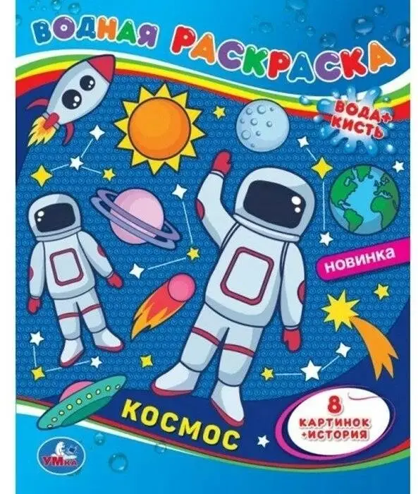 Водная раскраска «Космос‑1» от бренда «Умка» содержит восемь крупных картинок, которые раскрашиваются только водой с помощью кисточки. К каждой иллюстрации приложён небольшой комментарий, помогающий ребёнку лучше понять изображение. Книга выполнена из картона и бумаги, имеет мягкую обложку, размеры 25 × 20 × 1 см и вес 80 г. Предназначена для детей от 3 лет, развивая мелкую моторику, сенсорное восприятие, творческое мышление и внимательность. Издана в 2023 году издательством «Умка», штрих‑код 9785506067498.