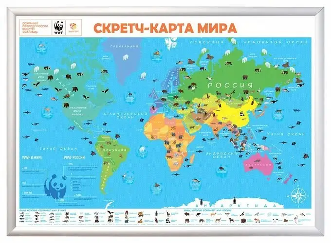 This is a special A1-sized scratch world map, the "WWF. Green Edition". It is a limited edition release commemorating the 25th anniversary of the World Wide Fund for Nature in Russia. The map highlights the habitats of rare animal species. Its dimensions are 59x84 cm.